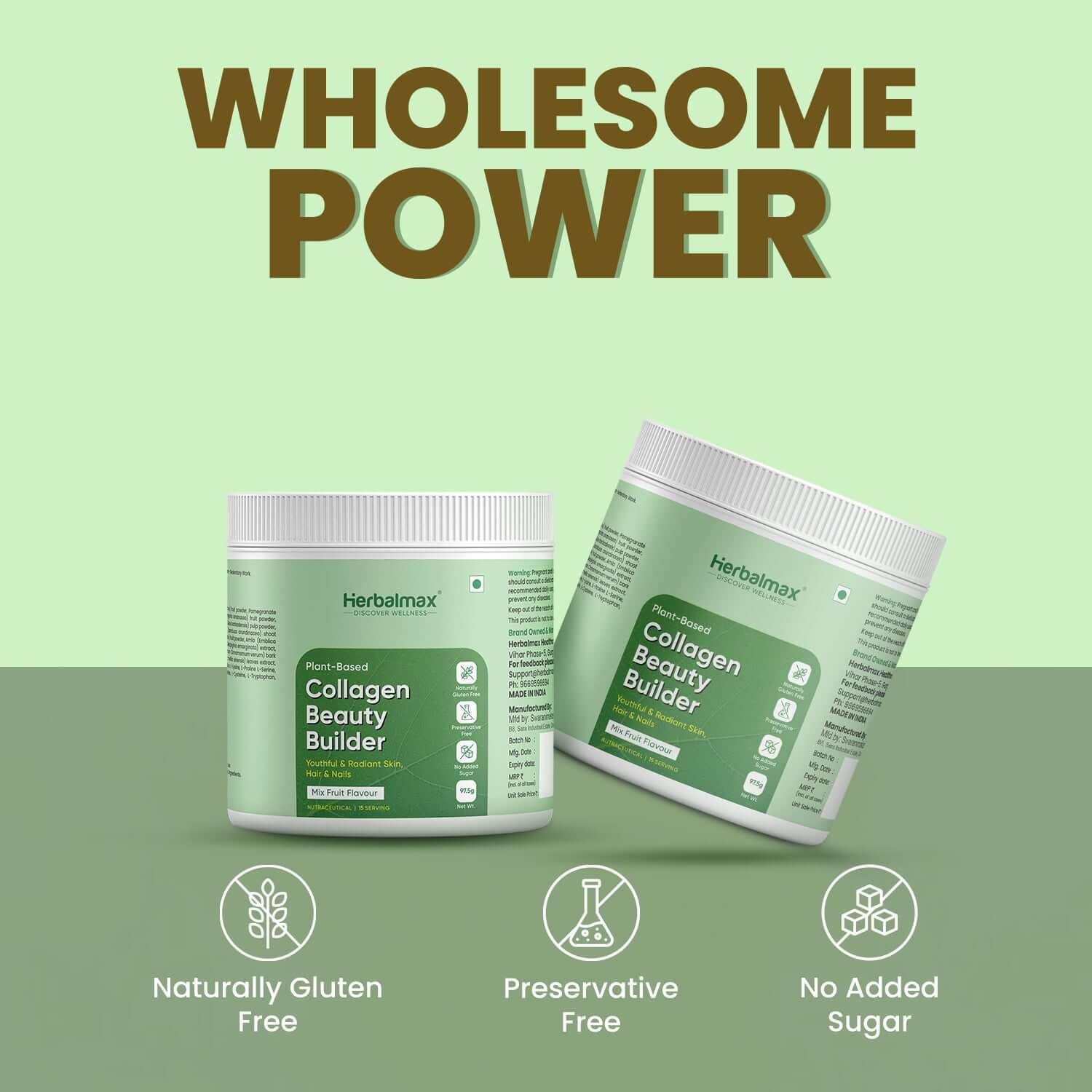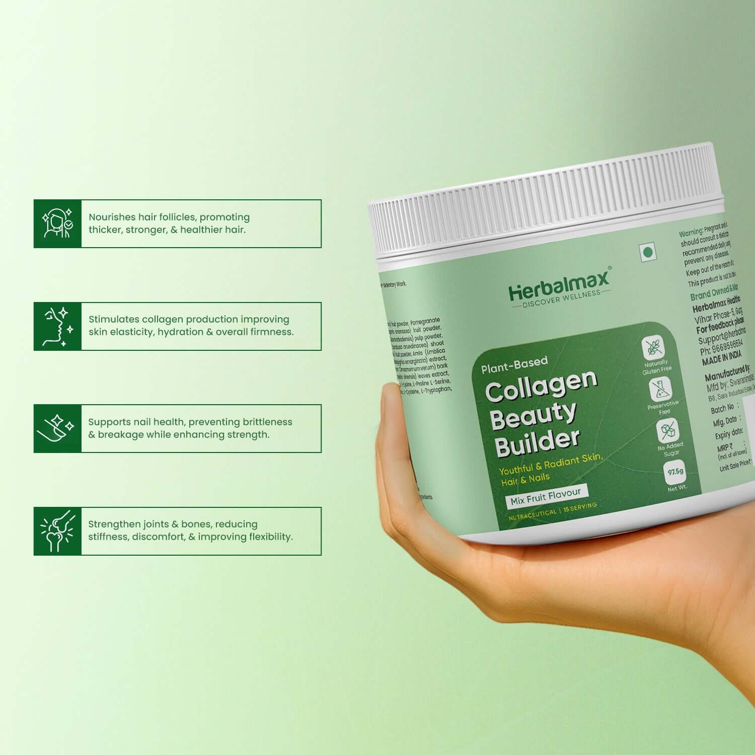 Herbalmax Plant-Based Collagen Beauty Builder supports healthy skin, hair, and nails. It helps keep skin smooth, hydrated, and youthful while reducing fine lines and early signs of aging by supporting the skinâs natural repair process. A gentle way to care for your skin every day.