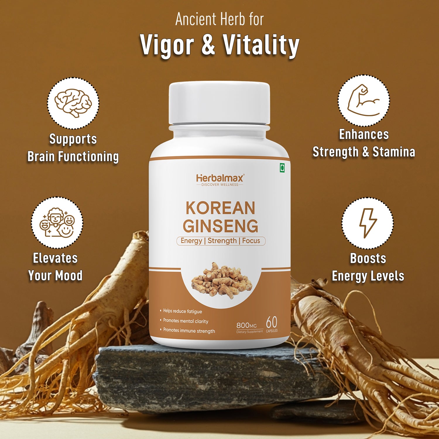 Preferred by those engaged in athletics and fitness, korean ginseng supplement enhances muscle strength, workout performance, and oxygen utilisation. It's a trusted tonic for daily strength as it facilitates quicker recovery, stamina, and fatigue.