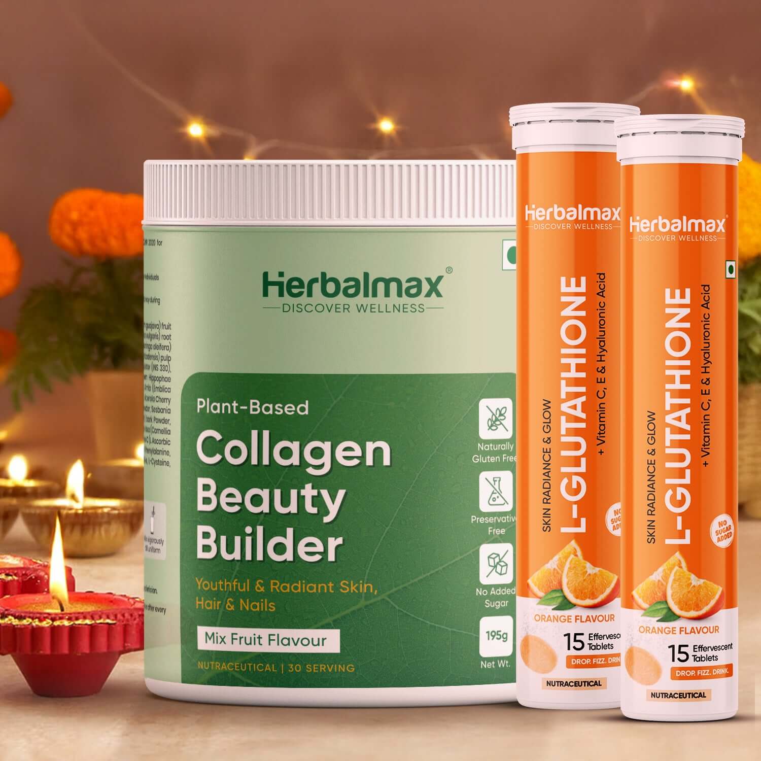 L-Glutathione Effervescent(Orange Flavour) and Plant-Based Collagen Beauty Builder is a tasty, easy-to-dissolve tablet that helps brighten skin, improve texture, and support a healthy glow. Packed with antioxidants and plant-based collagen boosters, it helps reduce dullness, fine lines, and promotes overall skin health from the inside out. Ideal for daily skincare support.