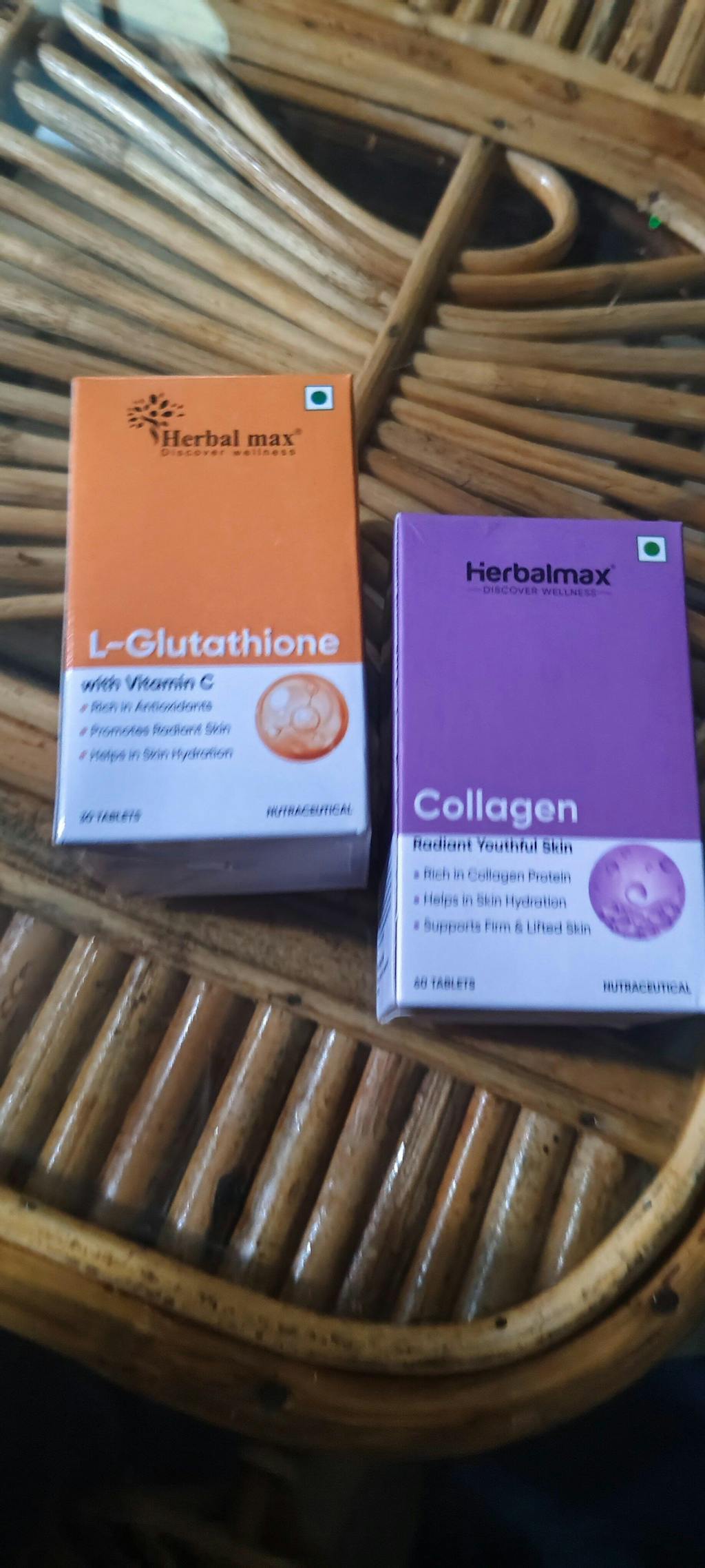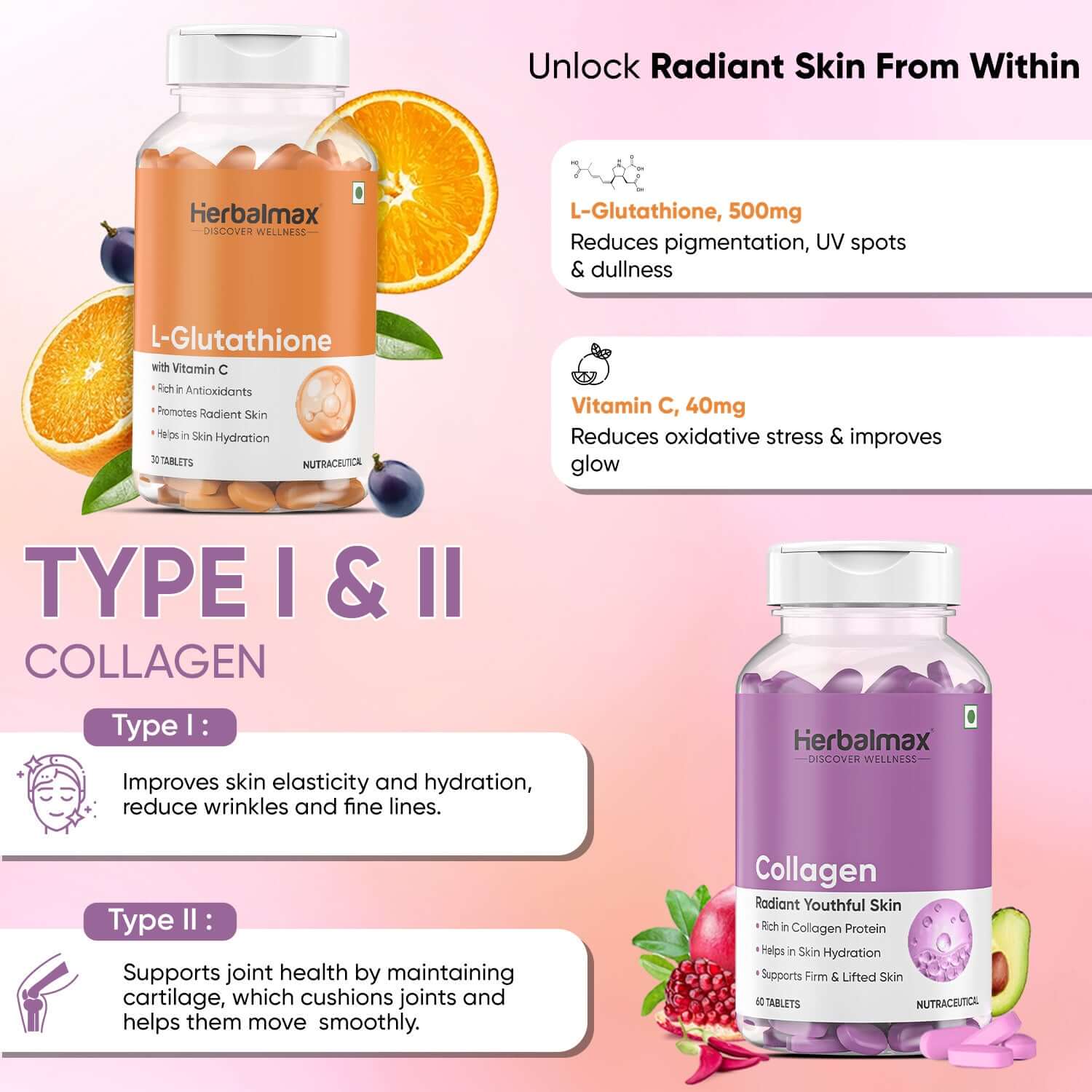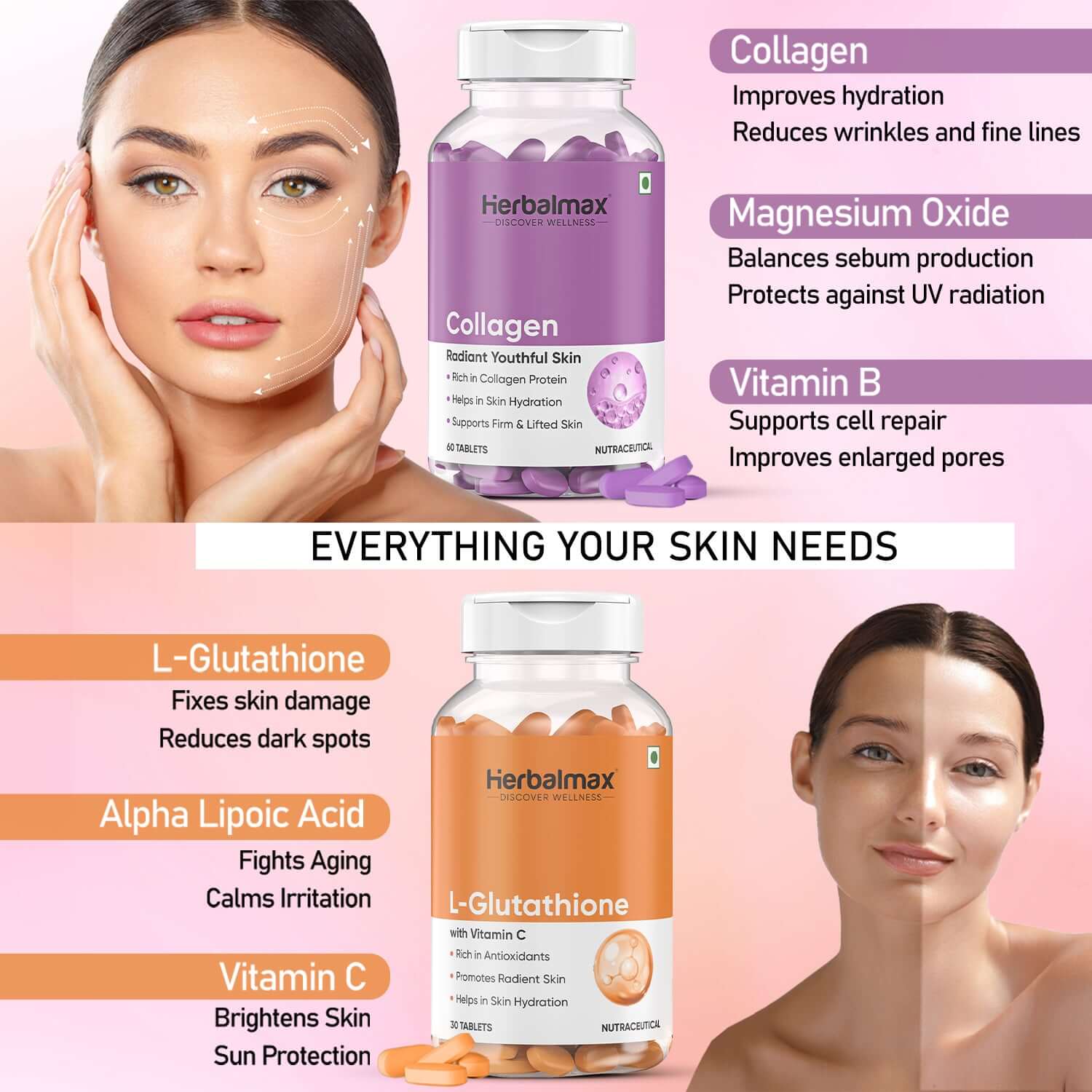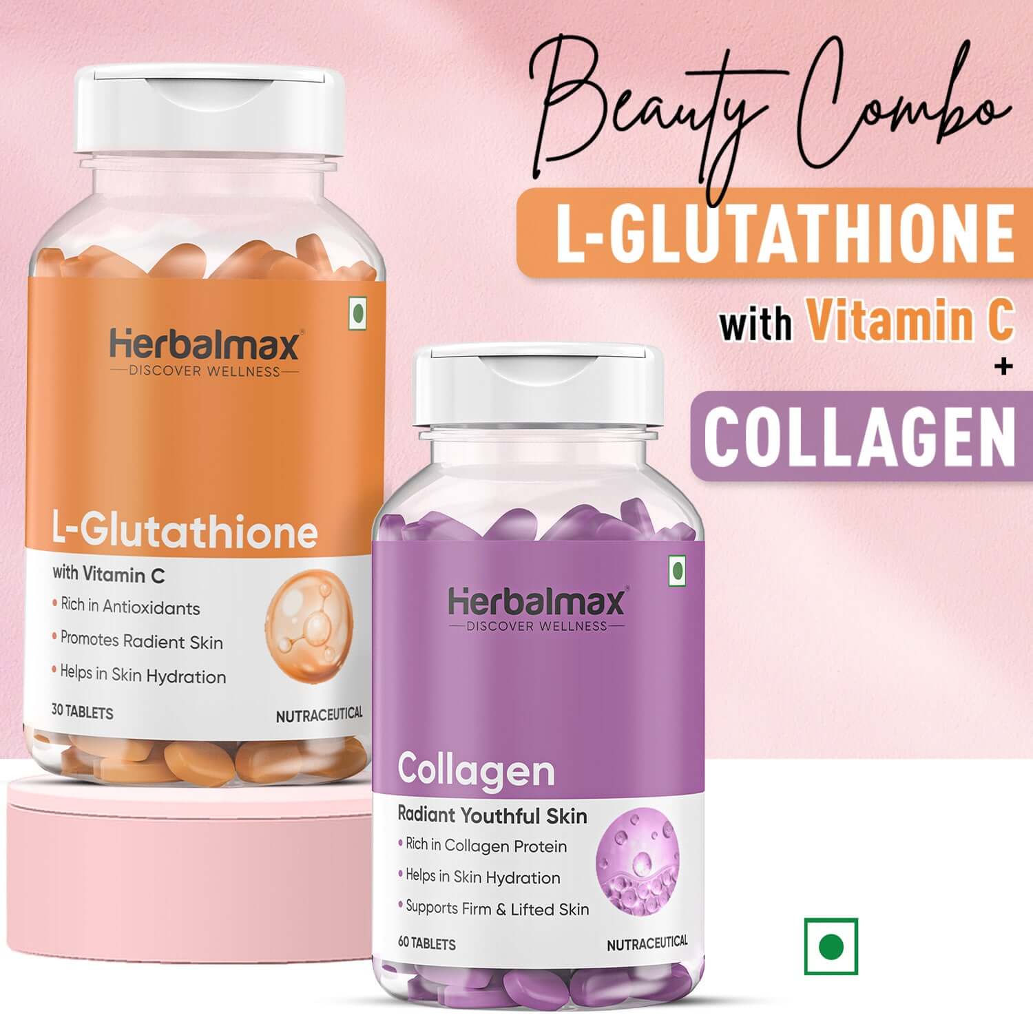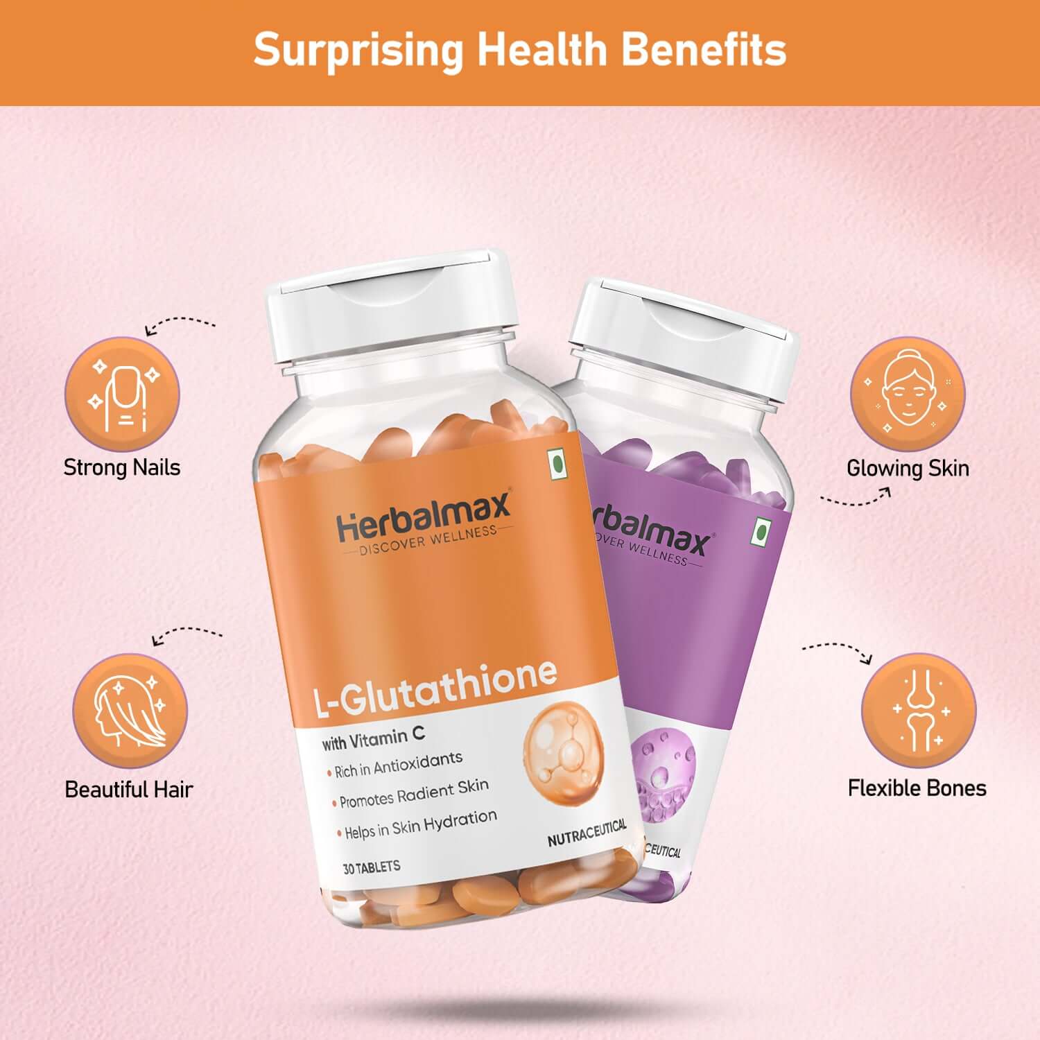 Herbalmax Collagen and L-Glutathione with Vitamin C is a powerful supplement that supports skin health, reduces pigmentation, and enhances overall glow. It helps improve skin elasticity, reduce wrinkles, and promote a youthful appearance. This combo also boosts immunity and detoxifies the body.