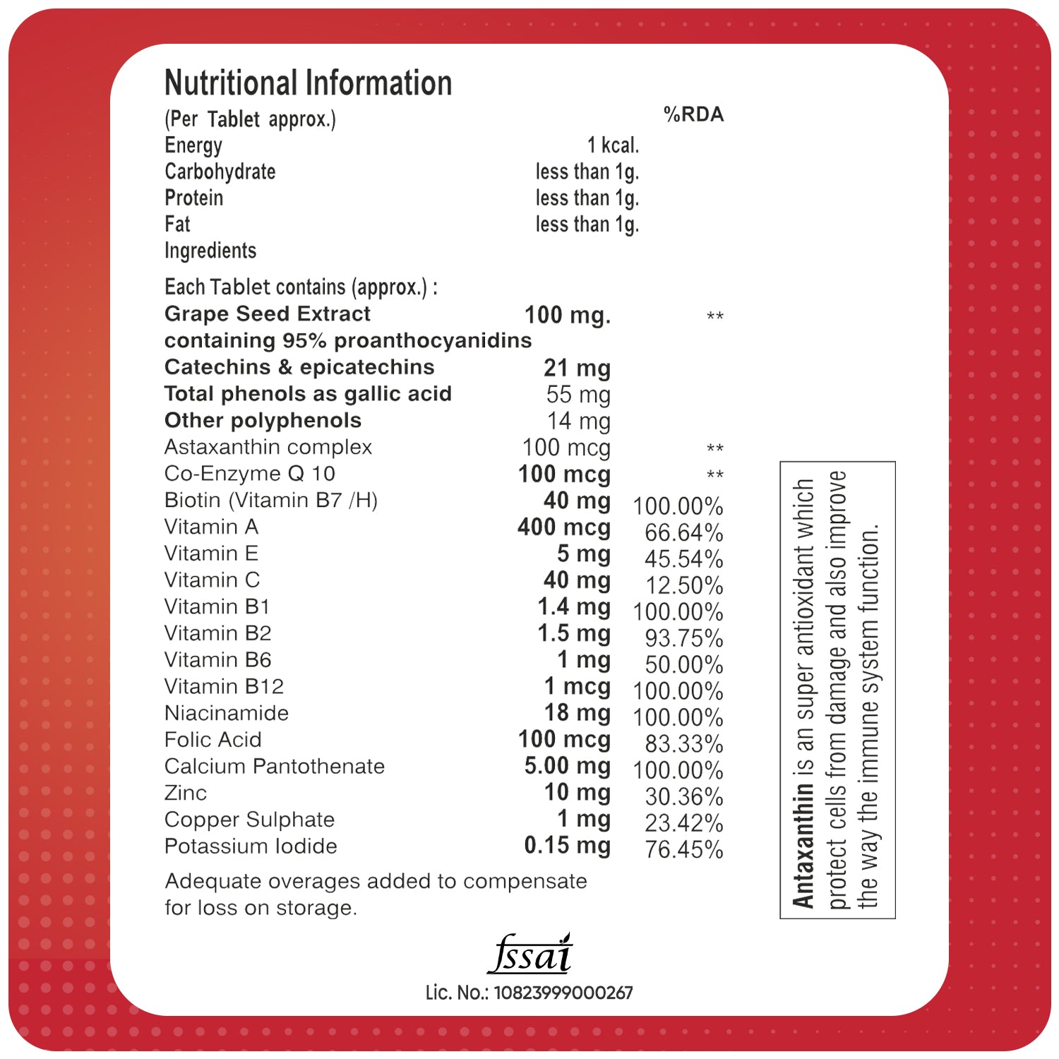 Each tablet contains 20+ essential nutrients, including vitamins like B12, C, and D, minerals like zinc and copper, and powerful ingredients like grape seed extract, astaxanthin, and co-enzyme Q10. These work together to help support your immune system, keep your skin and hair healthy, support heart function, and help you stay active and refreshed throughout the day.
