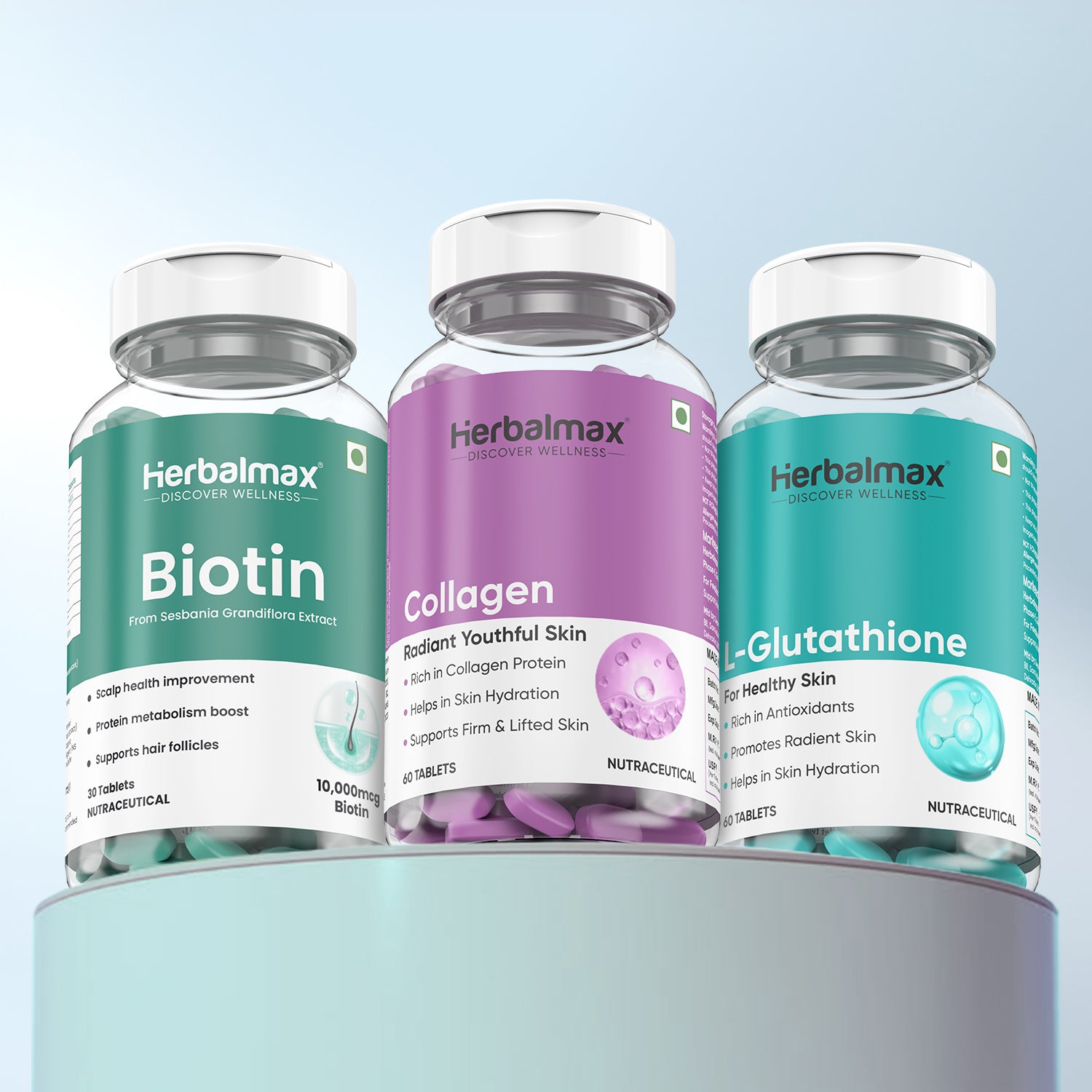 Glutathione + Collagen + Biotin Tablets Combo for Skin, Hair & Nails